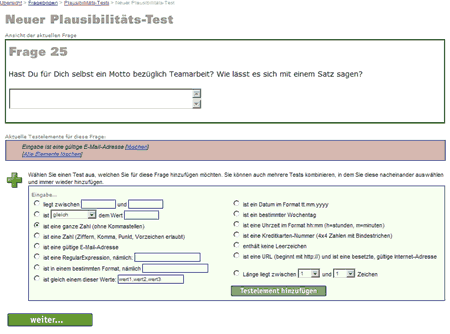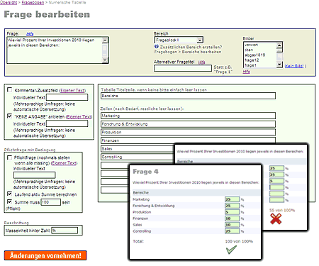 Bedingung Summe muss z.b. 100% ergeben (Prüfergebnis wird dem Teilnehmer während der Eingabe laufend anschaulich angezeigt)