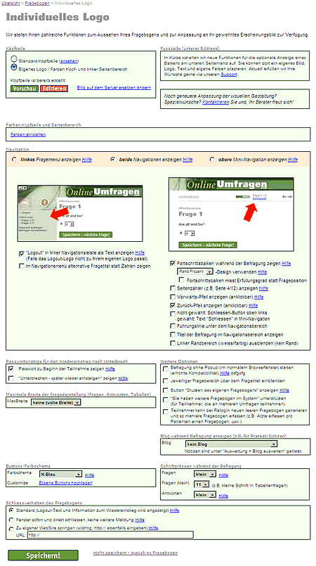 Zahlreiche differenzierte Optionen zu Navigation, Passwortanzeige, Layout, Kommunikations-Optionen, Schriftgrössen, Ziel-URL nach Befragung, uvm.