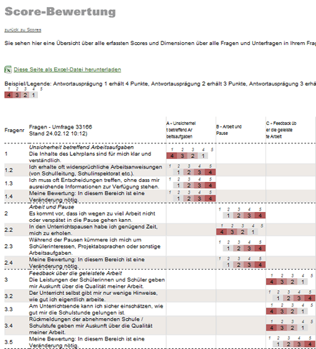 Übersicht über alle definierten Dimensionen (im Bild A, B, C, ...) und alle Fragen (vertikal) sowie in den Zellen über alle definierten Scores in Abhängigkeit der jeweiligen von den Teilnehmenden gewählten Antwortausprägungen (einfach Kontrolle und Prüfung aller Scores auf einen Blick)