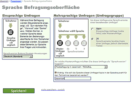 Sprachversionen mit unterschiedlicher Ablauflogik und speziellen Fragen möglich