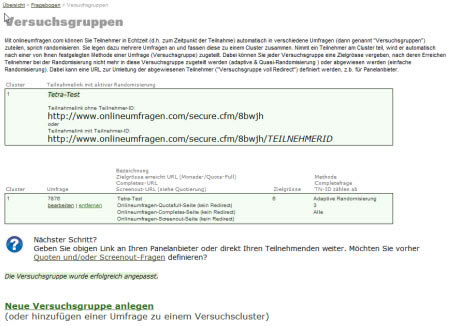 Fassen Sie mehrere Umfrageversionen zu Versuchsgruppen unter einem gemeinsamen Startlink zusammen. Dabei erhält jeder Teilnehmer zufällig eine bestimmte Umfrage.Oder generieren Sie einen In-Link und Backlinks für Ihren Panel-Anbieter (Complete, Screenout, Quotafull).